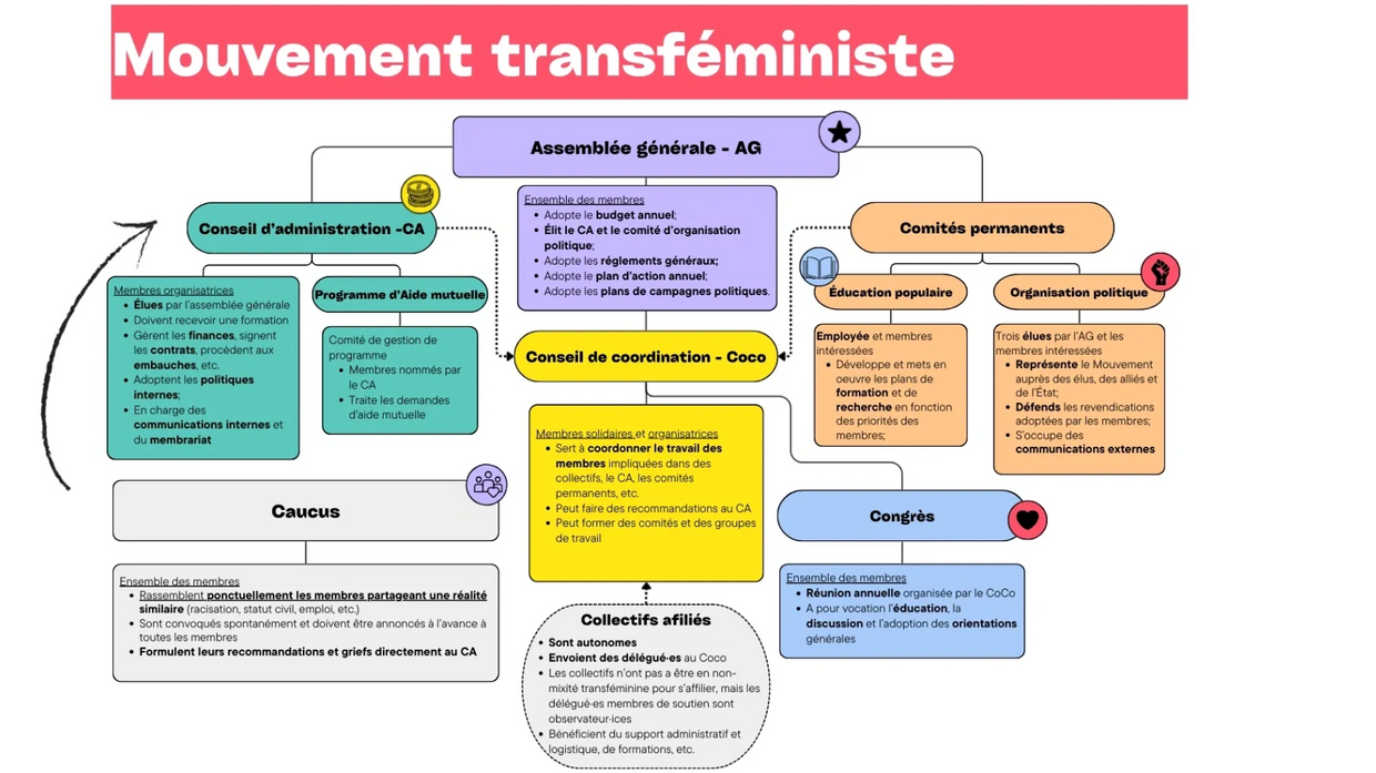 Le Mouvement a pour vocation de multiplier et de soutenir les collectifs qui oeuvrent, en autres, à l’amélioration des conditions de vie des femmes trans ou personnes transféminisées. Leur mode de fonctionnement est entièrement autonome.